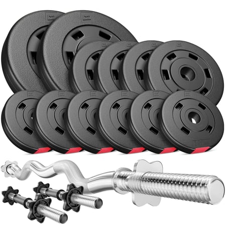 Kunststoff Hantelset 36 kg (2 x 5 kg, 4 x 2,5 kg, 6 x 1,25 kg ) mit Hantelstangen Ø 30 mm: 2 x Kurzhantelstange 45 cm und 1 x SZ-Curlstange 120 cm inklusive 6 Sternverschlüße