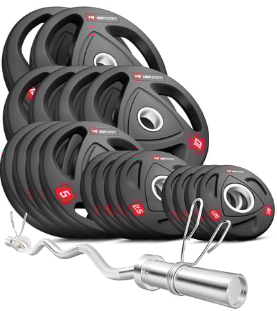 Olympia Hantelset 114 kg (2x15kg, 4x10 kg, 4x5 kg, 4x2,5 kg, 4x1,25 kg) mit SZ-Curlstange 120 cm Ø 50 inklusive 2 Federverschlüße aus Metal und Hantelscheiben mit universeller Lochbohrung 51 mm