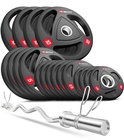 Olympia Hantelset 89 kg (2x10 kg, 2x5 kg, 2x2,5 kg, 4x1,25 kg) mit SZ-Curlstange 120 cm Ø 50 inklusive 2 Federverschlüße aus Metal und Hantelscheiben mit universeller Lochbohrung 51 mm