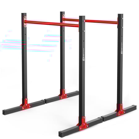 Die Grundkonstruktion der Dip-Station HS-1011K wurde aus qualitativ hochwertigem Vierkantstahl (38 x 38 mm) hergestellt, der zusätzlich mit einer Pulverbeschichtung überzogen wurde. Diese schützt vor äußeren Beschädigungen und Korrosion. Auch die Handläufe, welche aus 30 mm starkem Rohrstahl hergestellt sind, wurden mit einer roten, gut haftenden Lackierung umhüllt. Somit ist gewährleistet, dass die Dip-Station Ihnen viele Jahre lang ein treuer Begleiter sein wird.