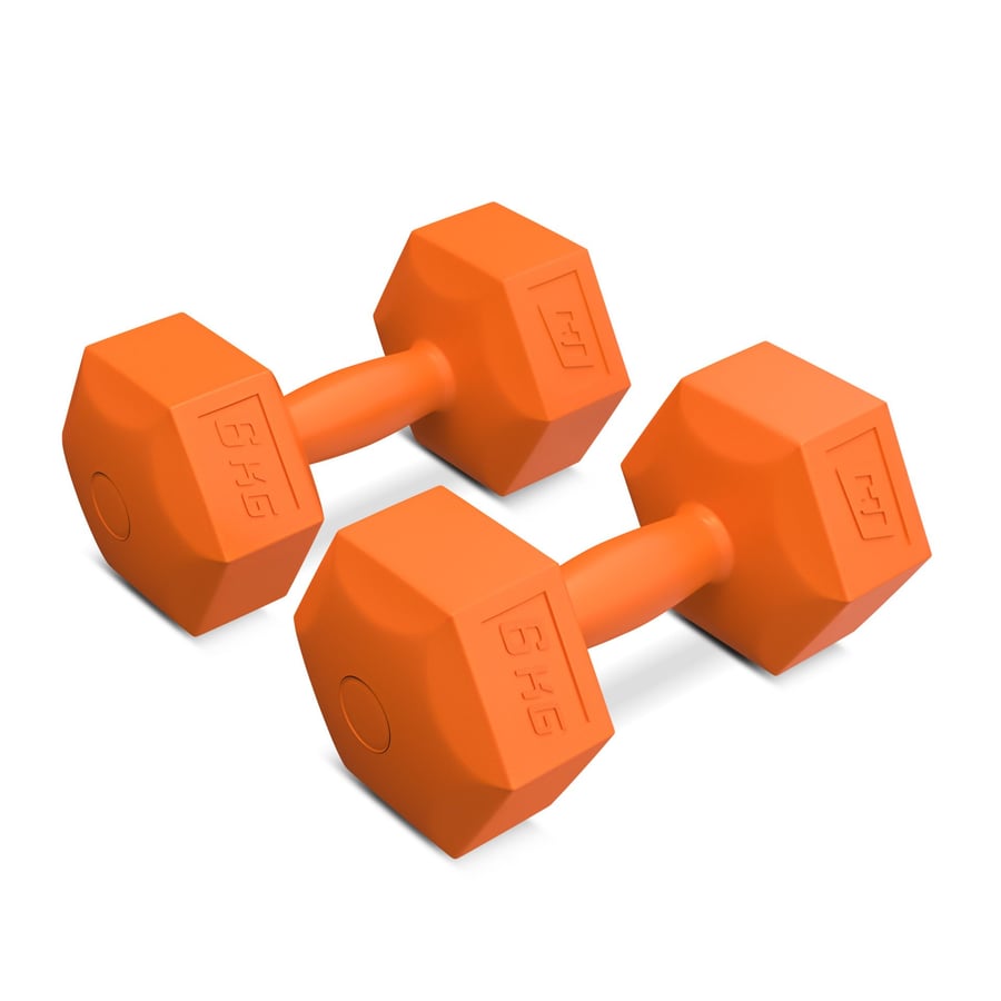 Ein Set von 2x6 kg Kurzhanteln aus Kunststoff von Hop-Sport mit einer sechseckigen Form für maximalen Komfort während des Gebrauchs.