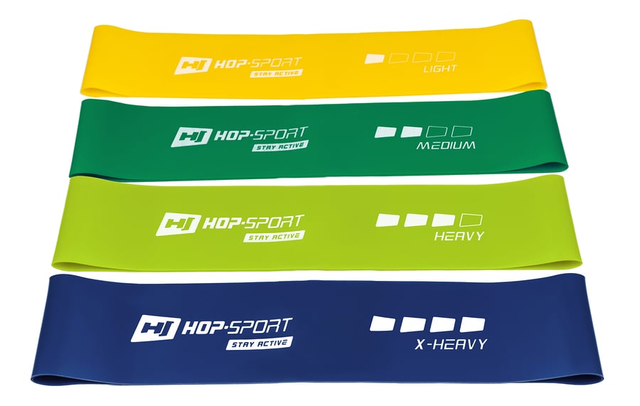 Das Prinzip von Widerstandsbändern ist, dass je mehr Sie sie dehnen, desto mehr Widerstand erzeugen sie. Dank dieser Funktion können Sie die Belastung ganz einfach an das aktuelle Trainingsstadium anpassen. Jeder der vier im HS-L550RL-Set enthaltenen Latexbänder erzeugt einen unterschiedlichen Lastbereich: